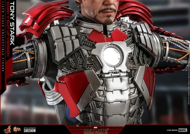 Shows up in the middle of the race circuit and demonstrates a near-perfect command of plasma-powered whips, Whiplash challenges Tony Stark’s strength while he was driving in a formula car. Inspired by the Mark V suiting up scene on the race track in Iron Man 2, Hot Toys present the Tony Stark (Mark V Suit up Version) Sixth Scale Collectible Figure. Demonstrates perfectly designed armour pieces with mechanical details and articulated function, allowing fans to assemble the stunning armour on top of the highly-detailed figure.The movie-accurate figure is finely crafted based on Robert Downey Jr. as Tony Stark/Iron Man in the movie, features a newly developed Tony Stark head sculpt with specially applied battle-damaged effects; a stunningly detailed racing suit; LED light-up function design on arc reactor, and forearms; attachable Iron Man Mark V armour parts in defined proportion including helmet, chest and shoulders armour, upper back armour, thigh, and calf armours, hands with articulated fingers; skilfully painted in red and silver colouring with an astonishing metallic appearance; several pieces of interchangeable armours for different assembling looks; and a figure base.