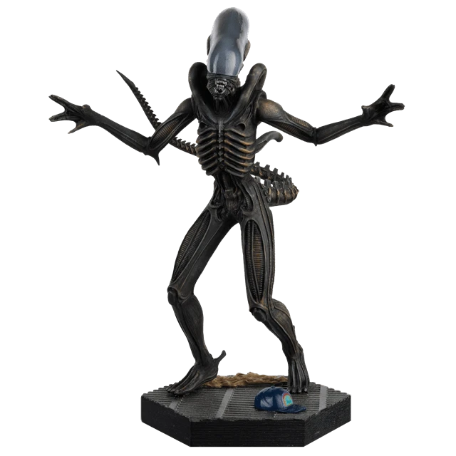 The extra-terrestrial Alien Xenomorph figure as seen in 1979’s iconic film “Alien”. Designed by H.R Giger and brought to life by director Ridley Scott. The Xenomorph figurine is over 15cm tall and is presented in a standing attack pose capturing the skeletal terror with acid for blood, a vicious tail and two sets of lethal jaws with its recently shed skin on the base as well as the Nostromo crew hat from its first victim in its adult form – Engineering Technician Samuel Brett. Alien fans shouldn’t miss the chance to own this menacing hand-painted Xenomorph sculpted using reference material supplied by the film studio. 15.4cm. 14+ collector figure.