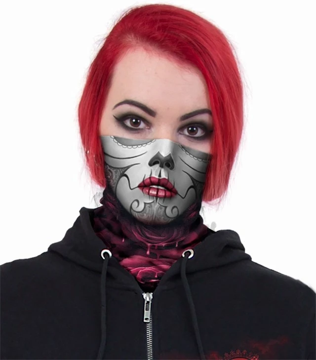 A beautiful garland of gothic roses, but look closely, is that blood? This multifunctional face covering is made of 100% Soft and Stretchy Microfibre Polyester, 50cm x 25cm using high quality breathable microfibre that protects against the Heat (Moisture Wicking); Cold ; Wind; Dust and Insects. This seemless Loop Scarf can be used as a Face Mask; Balaclava; Headband; Wristband; Beanie and lots more. Suitable for climbing, running, cycling, motorcycling , boating, skating, skiing, surfing or just raving!