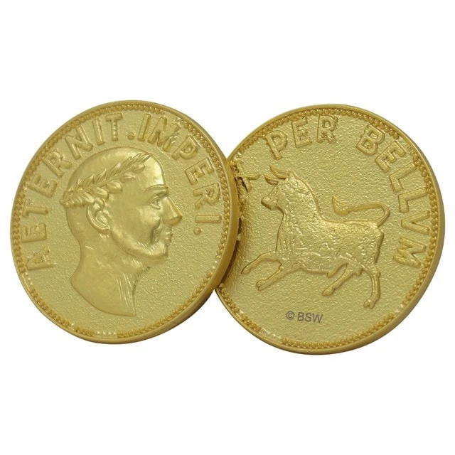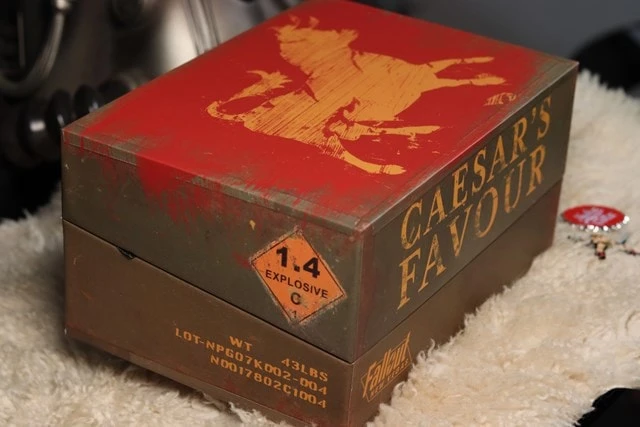 This premium Ceasars Legion presentaion case contains replica’s from the Fallout faction, a 24k gold plated extra large pin badge, 24k gold and .999 silver plated coins used by the faction and a 24k gold plated necklace. Limited to 2010 units worldwide
