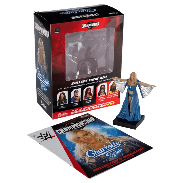 This superb metallic resin 1:16 scale figurine captures Charlotte Flair in her stunning blue-winged cape with silver embroidery, black knee-high boots and wearing a blue and black outfit. It stands over 12.3 cm tall and weigh in at 137 grams on a ring style WWE base. The figurine comes with an officially approved 16-page magazine. Written by WWE experts, the magazine takes a look at Superstar Charlotte Flair career, her greatest matches and signature moves