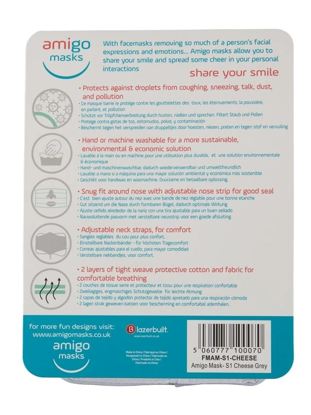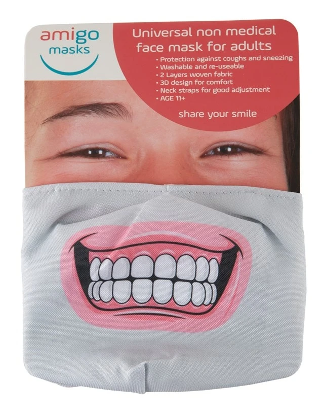 Protective Reusable Washable Unisex face mask. Amigo Masks are designed to “Share your Smile”! Break down barriers that a plain mask puts up and spread some cheer, not fear!…. Fun Printed design to amuse your friends! PROTECTIVE ; Against droplets from coughing, sneezing, talk, dust and pollution REUSABLE & WASHABLE ; For a more sustainable, environmental and economic solution COMFORTABLE FIT; Adjustable nose strip and head straps for comfort and to create a good seal around the face 2 LAYER COTTON; 2 layer tight weave protective Cotton and fabric for comfortable breathing. Woven pocket for PM filters for those most vulnerable UNISEX fit; 12+year upwards