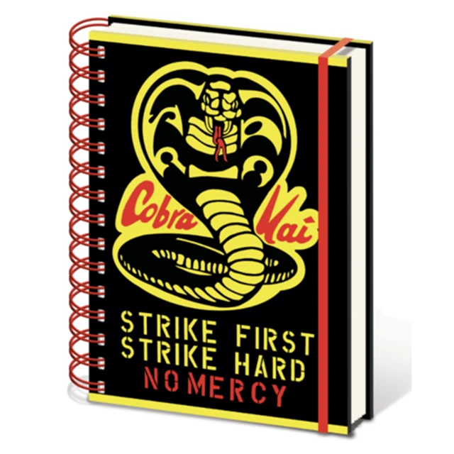 Show the world your love for Cobra Kai with this officially licensed Cobra Kai A5 wiro notebook. The cover features the Cobra Kai cobra big and proud along with ‘Strike First, Strike Hard, No Mercy’ – the Cobra Kai mantra. Inside you’ll find 80 ruled sheets, perfect for writing down your victories or sweet, sweet moves. Perfect for any Karate Kid or Cobra Kai fan!