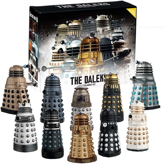The Daleks are here to exterminate with this extra-terrestrial Daleks Parliament Figurine Box Set containing 10 Metallic Resin Daleks from Doctor Who. These Dalek figures all stand approximately 8 cm tall and is on a base to show them. The set comes with a 68-page magazine, read every adventure detailing the appearance and impact of the characters. Presented in a full-colour box.