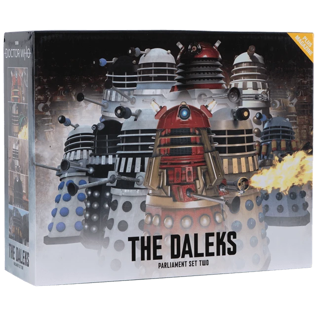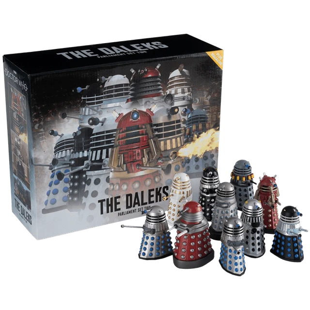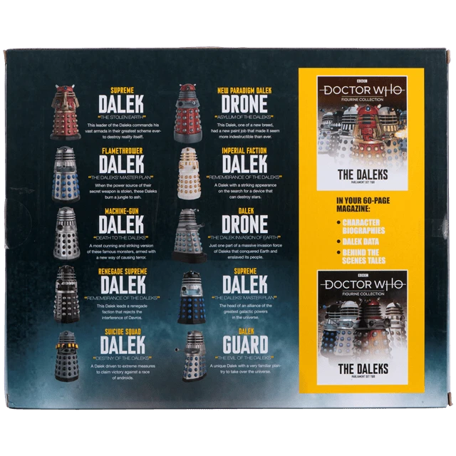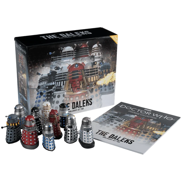 Watch out the infamous arch-enemies of the Doctor are now together in harmony in this magnificent Daleks Parliament Figurine Set Two containing 10 Daleks from Doctor Who The Official Figurine Collection. These Dalek models present the Doctor’s oldest and most feared foe in loving detail, and every sculpt is based on a detailed study of the original production photography, props and drawings. Each Dalek is cast in a special metallic resin and painted by hand, in a perfect 1:21 scale and stands approximately 8 cm tall along with a base to showcase them. The set comes with a 60-page magazine, read every adventure detailing the appearance and impact of the characters. Presented in a full-colour box.