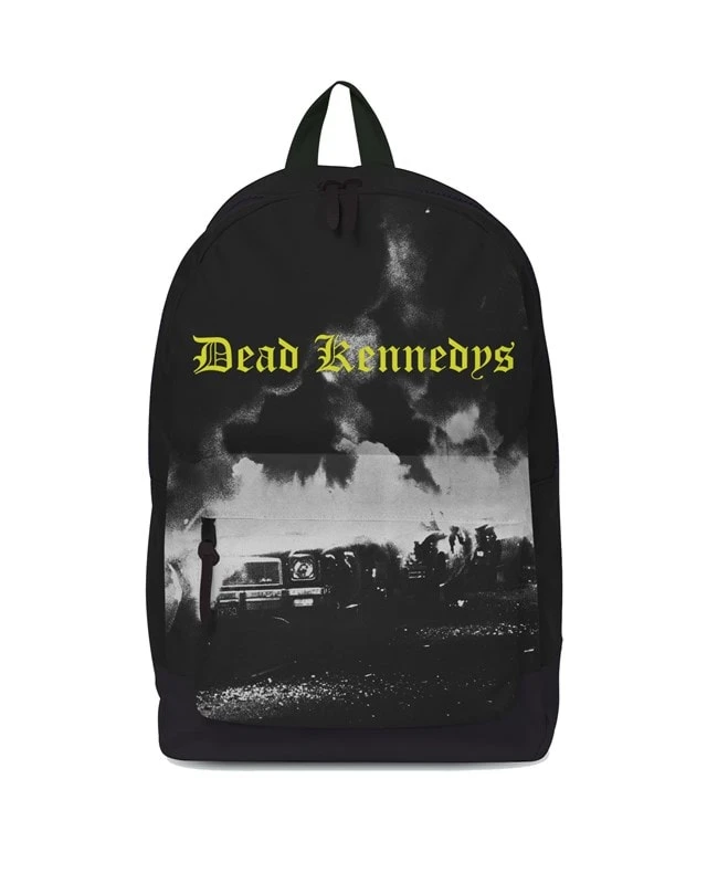 This Dead Kennedys backpack features the Freash Fruit album cover image on a black bag. This backpack has two padded interior sections with velcro to hold a laptop safely. The back also has a front pocket and a bottle holder on the side. Height 43cm x Width 30cm x Depth 15cm