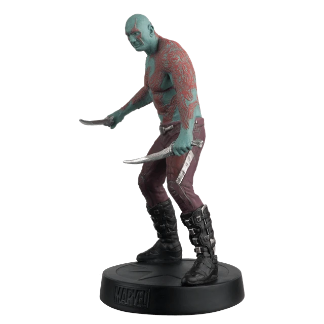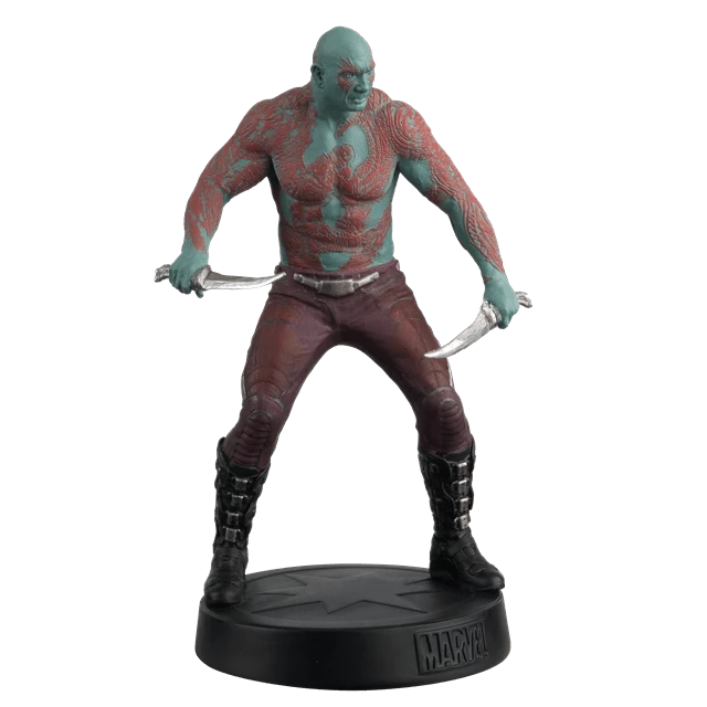 Taking inspiration from the hit movie Guardians of the Galaxy, this collectible Marvel Drax figurine has been hand-painted and sculpted according to the features of the actor Dave Bautista, champion of wrestling and expert in martial arts who plays Drax the Destroyer. The Marvel figurine stands approx 13cm tall and features Drax’s iconic detailed tattoos, ready for battle with a dagger in each hand. This muscled superhero is on a quest to punish those responsible for killing his family. Accompanied by a 16-page full colour magazine which looks at Drax’s role in the Guardians of the Galaxy. Made from hand-painted resin.