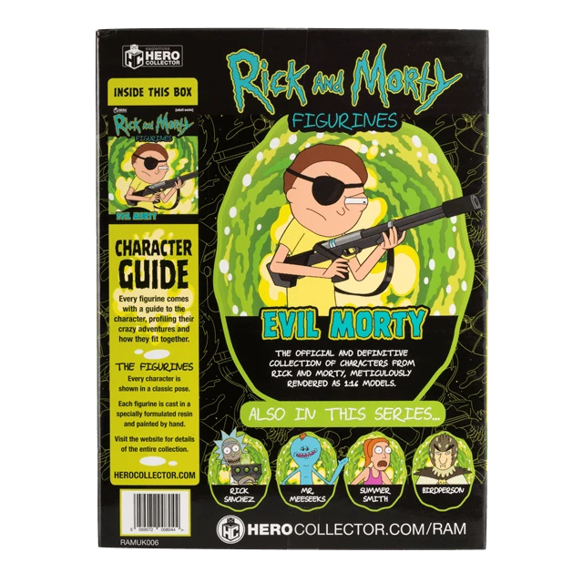 This detailed 1:16 scale Evil Morty figurine perfectly captures Evil Morty in his black eye-patch, that is actually a transmitter used to control evil Rick. Hand-painted, Morty stands atop a portal-themed display base approx. 10 cm tall.Evil Morty Figurine comes with a 16-page illustrated magazine featuring information about your figurine and key moments from Evil Morty’s life.