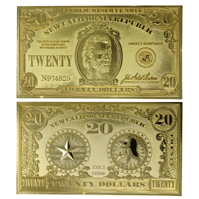 New California Republic $20 bill, heavily embossed metal with 24k gold plating, limited to 1997, individually numbered and supplied with a display stand within it’s presentation box.
