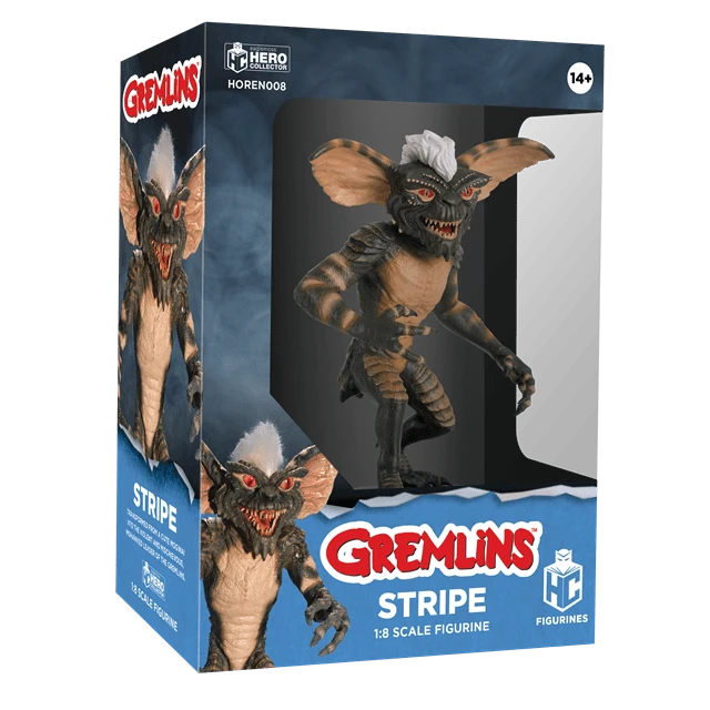 Hand painted resin “Stripe” figure from the iconic movie “GREMLINS”. Do NOT expose them to sunlight, do NOT get them wet, and NEVER, EVER feed them after midnight. Kingston Falls is an idyllic small town – until the Gremlins take over. A father returns from Chinatown with an unusual pet, a Mogwai – a gift for his son. When the rules are broken the consequences multiply at an alarming rate. Now it’s time for a Gremlin to visit your home. 220 x 80 x 150mm. 14+ collector figure.