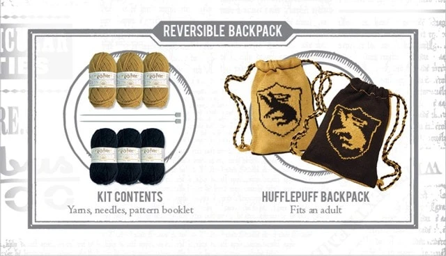 Take a little bit of magic with you wherever you go with this Hufflepuff Reversible Backpack Knitting Kit! Knit your own Hufflepuff House Reversible Backpack using the house colours of yellow and black. The pattern will help you create a Harry Potter-inspired backpack with a yellow background and black badger sigil in the middle. But wait! The other side magically transforms (with your help) and has a black background with the yellow badger sigil instead! Product Features: Yarn: 3 x Yellow (25g), 3 x Black (25g), Pair of 3.5 mm knitting needles. This knitting kit contains everything you need to make a Hufflepuff House Reversible Backpack, including all materials and pattern booklet. Age recommendation: 14+