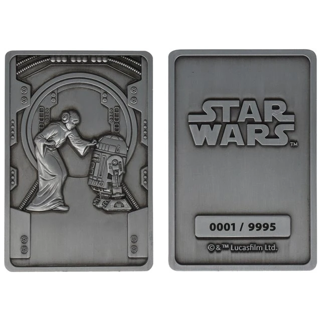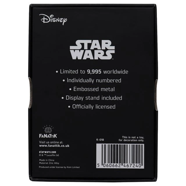 This officially licensed Star Wars metal collectible is limited to 9,995 worldwide and individually numbered. Featuring an iconic scene from the film, it measures approx 75 x 50mm and is embossed on both sides. The piece comes in a display box along with a stand.