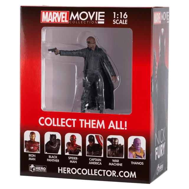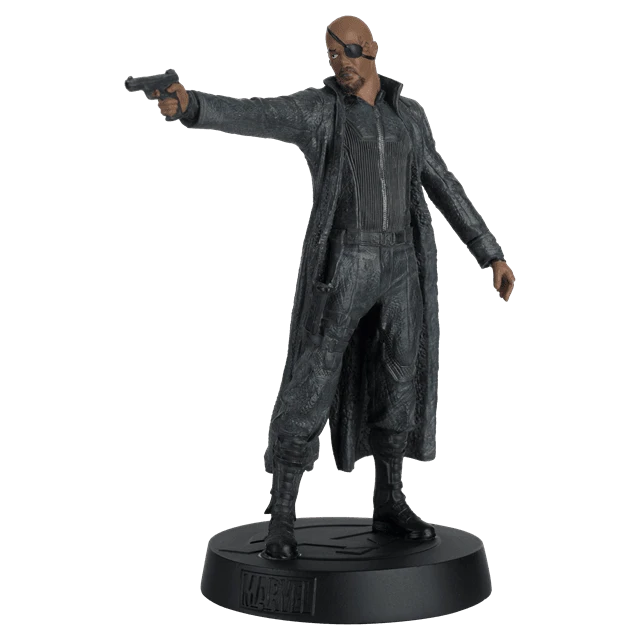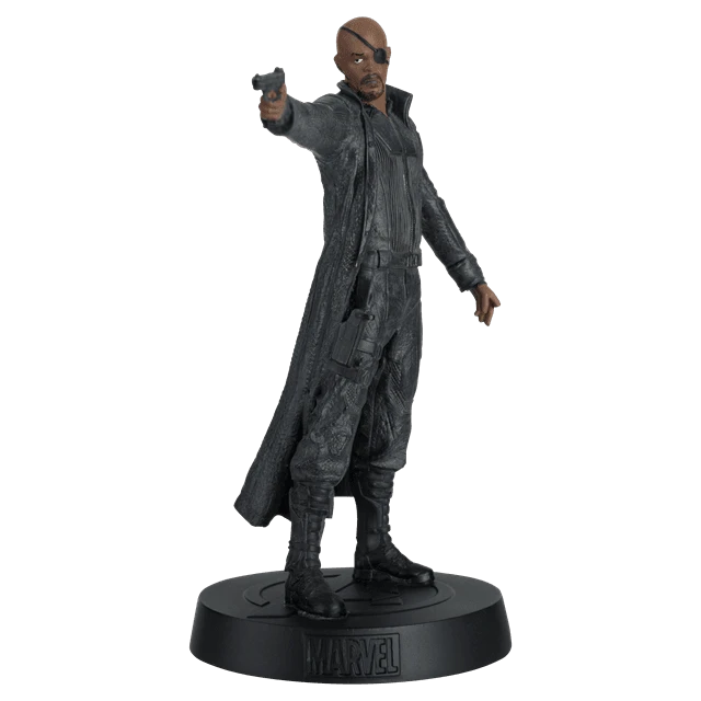 This Marvel Nick Fury 1:16 scale figurine captures the likeness of Samuel L. Jackson as Nick Fury in The Avengers Movie. Your Fury figurine is brought to life in metallic resin and depicts Nick’s trademark black eyepatch, finely tailored black leather trench coat and detailed tactical boots whilst posing with his Smith & Wesson gun ready to shoot any enemies lurking in the shadows. The figurine comes in colour window box complete with a unique 16-page magazine that profiles the character Nick Fury and the actor Samuel L. Jackson.