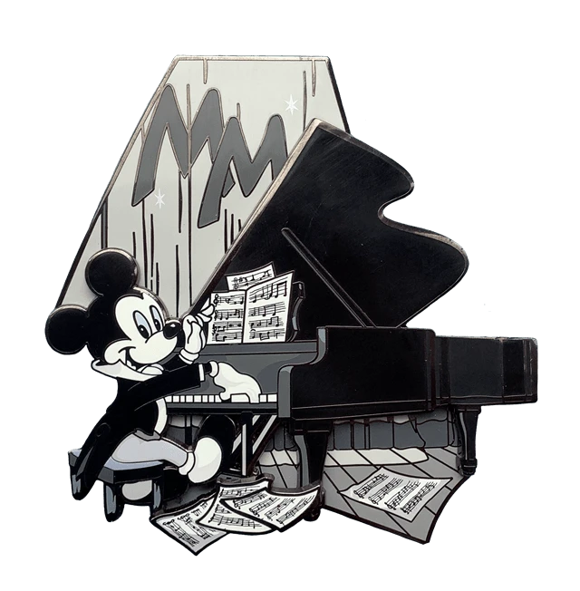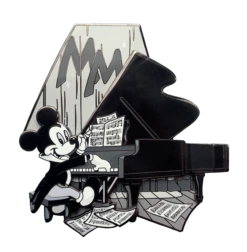 This large fine art pin features a black and white scene of Mickey Mouse in tails playing the concert piano surrounded by sheets of music.