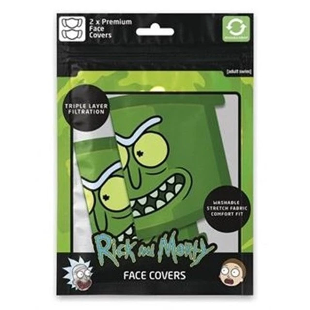 An officially licensed pack of 2x Premium Adult Face Covers featuring the Rick And Morty Pickle Rick Image. Made from 100% Cotton Stretch Jersey Fabric. Reusable and washable protective covering ideal for daily use.