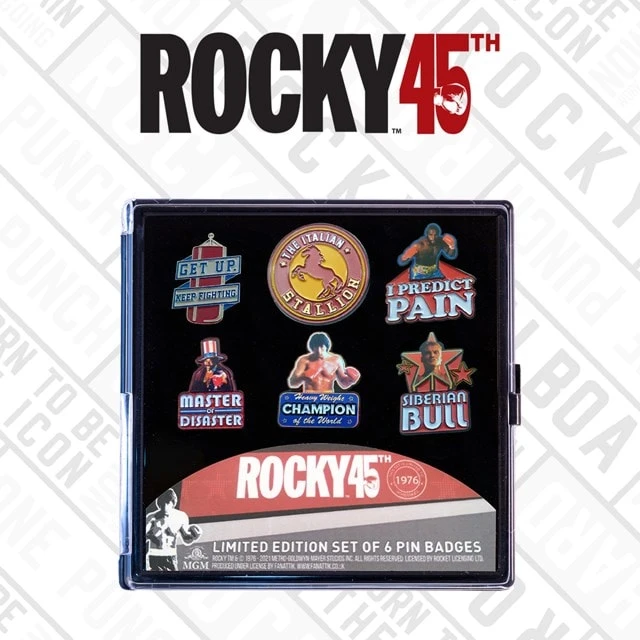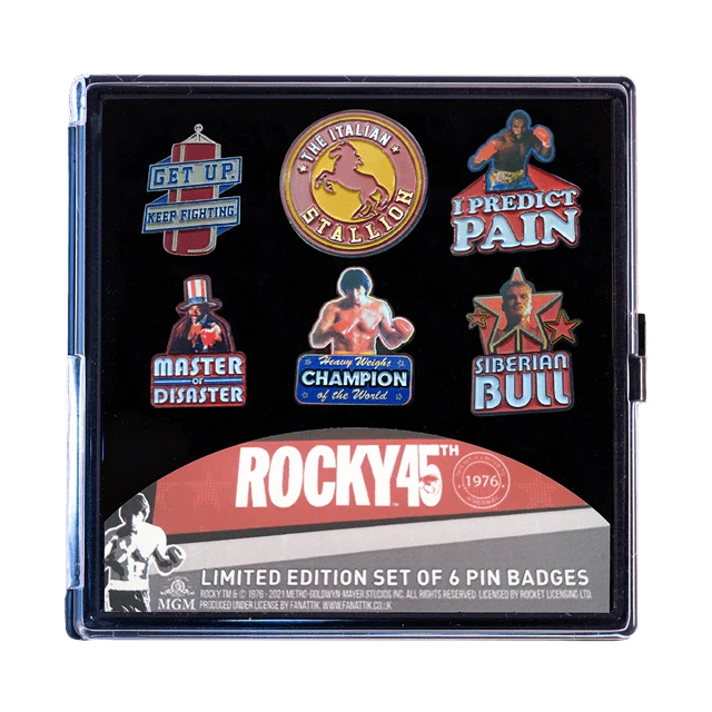 Rocky Limited Edition Pin Badges (Pack of 6). Limited to only 1976 units worldwide, celebrate the 45th anniversary of one of the most iconic films of all time with this set of enamel metal pin badges in a collector case.