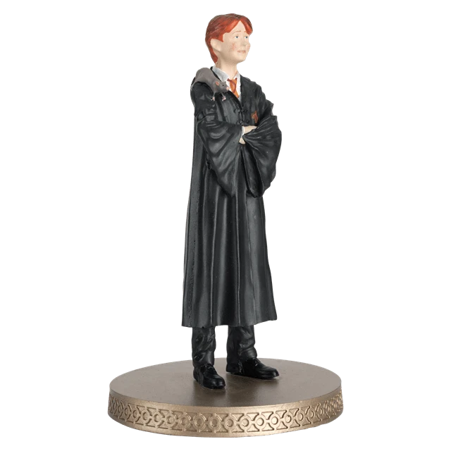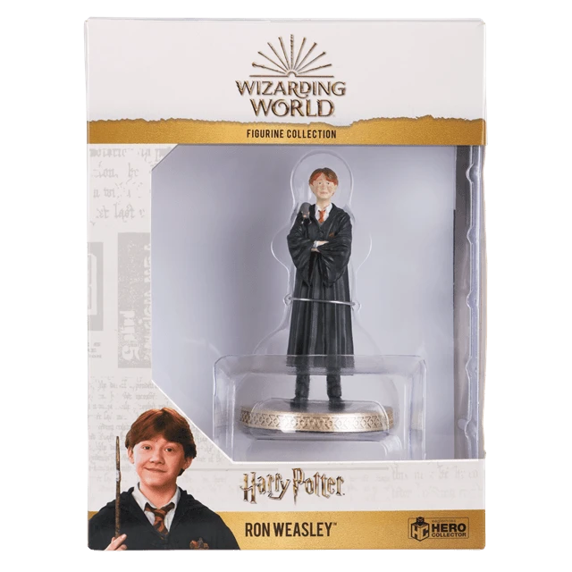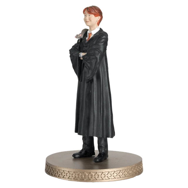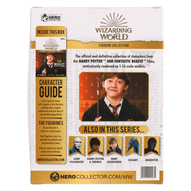 This Ron Weasley with Scabbers 1:16 scale figurine brings the young wizard to life. Hand painted, it captures Ron as seen in the “Harry Potter and The Philosopher’s Stone” film. Wearing his Gryffindor uniform complete with his top button undone, Ron is not the neatest Hogwarts student.He happily lets his pet rat sit on his shoulder, although he’d be less keen if he knew Scabbers’ real identity.He is packaged in a full -colour window display box and measures approximately 12 cm tall. Includes afull-colour glossy magazine.Suitable for ages 14+