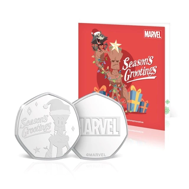 Pass on your ‘Season’s Grootings’ to someone special with this limited edition, .999 silver plated commemorative coin. The reverse of the commemorative features Groot alongside text reading ‘Season’s Grootings’. As this commemorative has been produced under official license, the obverse features the iconic Marvel logo. This special Christmas commemorative comes housed in a presentation pack that has been left empty inside for you to add your own special message.