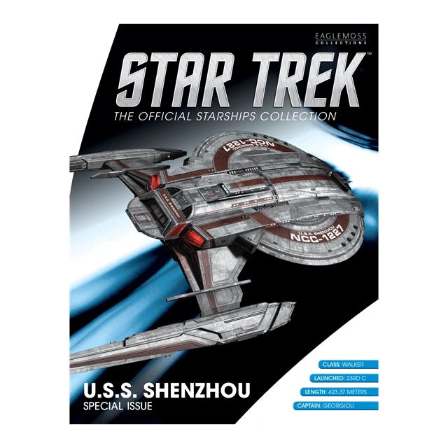 This fantastic Star Trek die-cast U.S.S. Shenzhou XL Starship model recreates the starship as seen in the Star Trek: Discovery. The model is hand-painted with intricate detail using references from CBS Studios own archives of designs and CG models, made from die-cast metal and comes with its own display stand. This U.S.S. Shenzhou XL Starship model comes with a 16-page full-colour magazine. The magazine includes a profile of the starship, original production art and details of its design evolution. Size: approx 30cm long