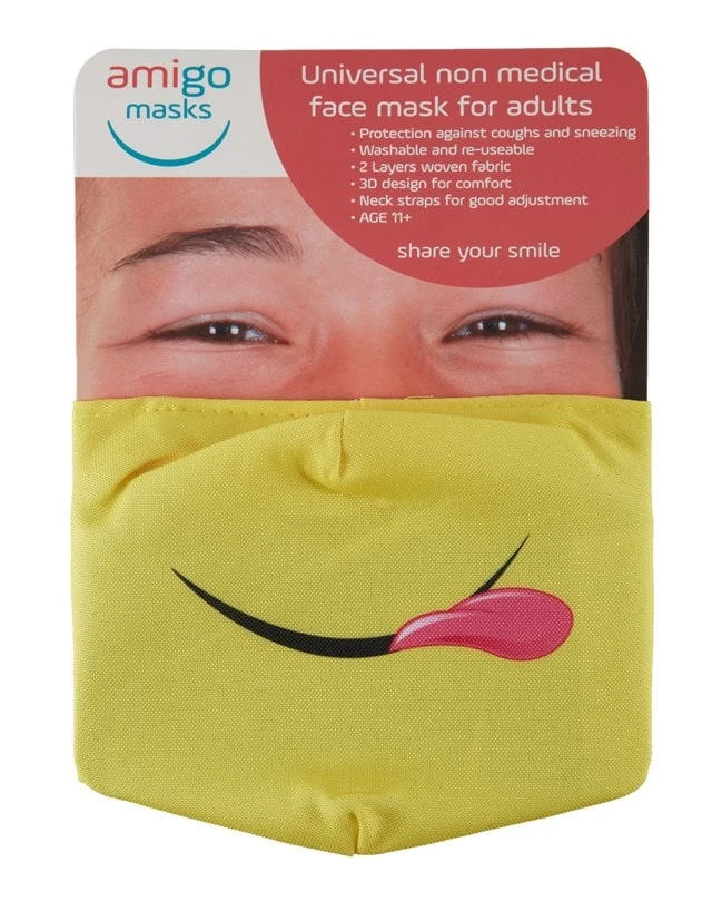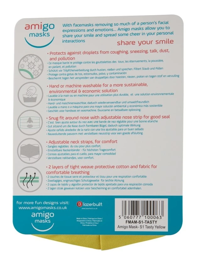Protective Reusable Washable Unisex face mask. Amigo Masks are designed to “Share your Smile”! Break down barriers that a plain mask puts up and spread some cheer, not fear!…. Fun Printed design to amuse your friends! PROTECTIVE ; Against droplets from coughing, sneezing, talk, dust and pollution REUSABLE & WASHABLE ; For a more sustainable, environmental and economic solution COMFORTABLE FIT; Adjustable nose strip and head straps for comfort and to create a good seal around the face 2 LAYER COTTON; 2 layer tight weave protective Cotton and fabric for comfortable breathing. Woven pocket for PM filters for those most vulnerable UNISEX fit; 12+year upwards