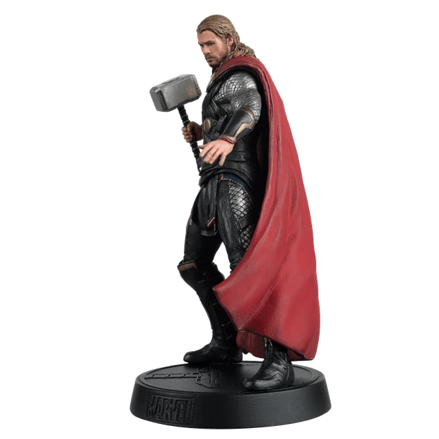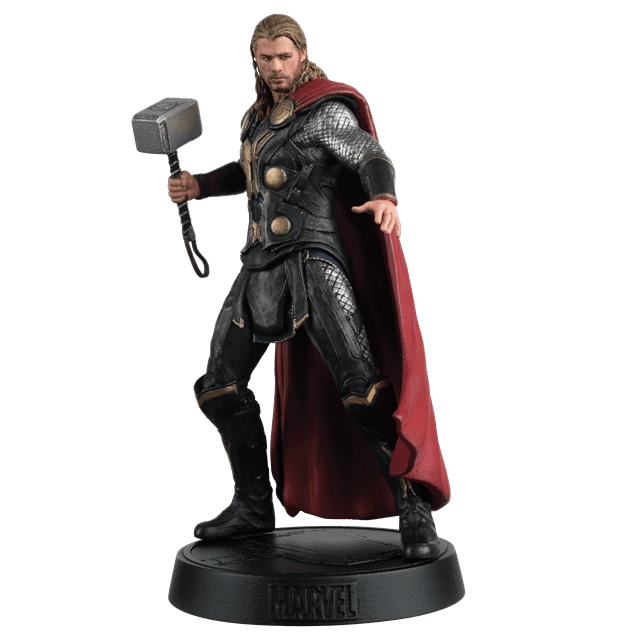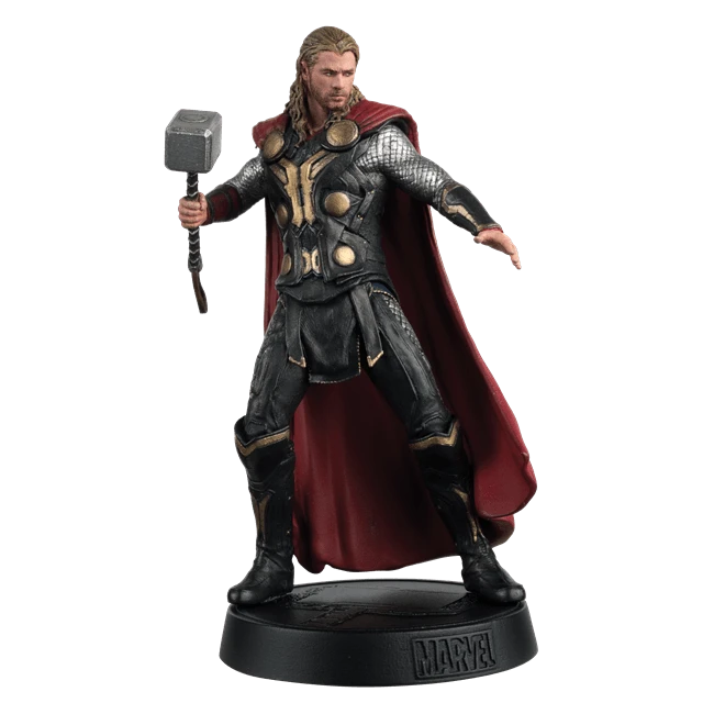 From “Thor: The Dark World” comes this intricately hand-sculpted metallic resin Thor 1:16 scale figurine, capturing the God of Thunder looking fierce while grasping his magical hammer, Mjolnir, held high ready for battle. His dramatic sculpted red cape flowing out behind him presented on a specially designed Marvel base. Includes a fully illustrated collector’s magazine packed with information about Thor Odinson and reveals the inside story of the movie. Made from metallic resin.