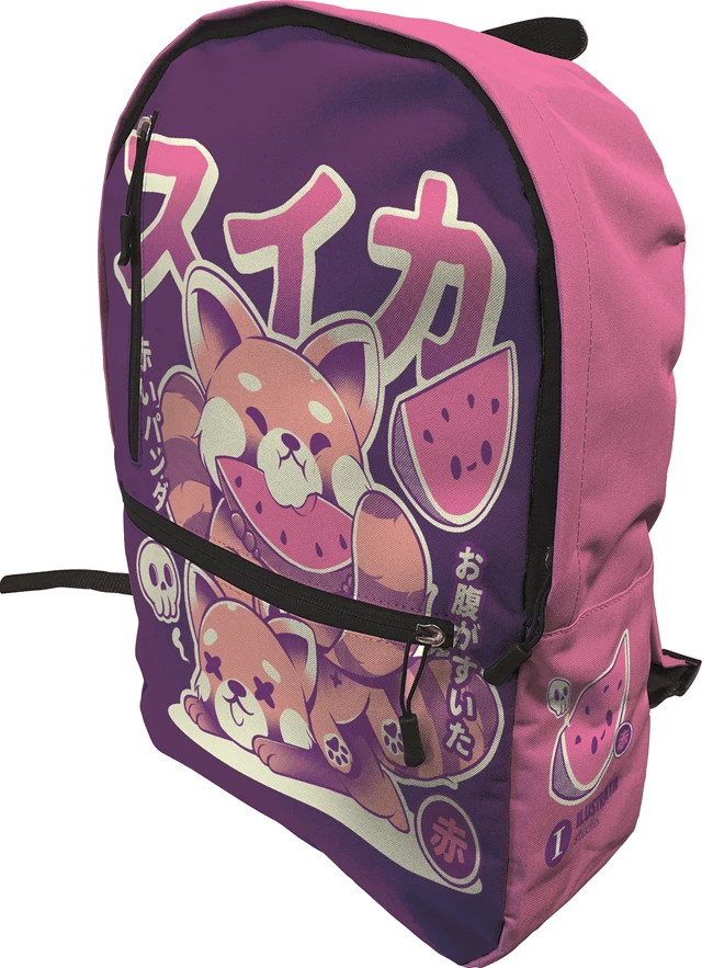 Another triumph from the house of Ilustrata! Show off your fun side with this awesome canvas backpack. Practical, with adjustable cushioned straps and not one but two individual zipped compartments to the front, featuring the triumphant red panda enjoying his watermelon sugar prize! Measuring 40cmx30cm x 12cm – perfect for school, college, festivals etc.